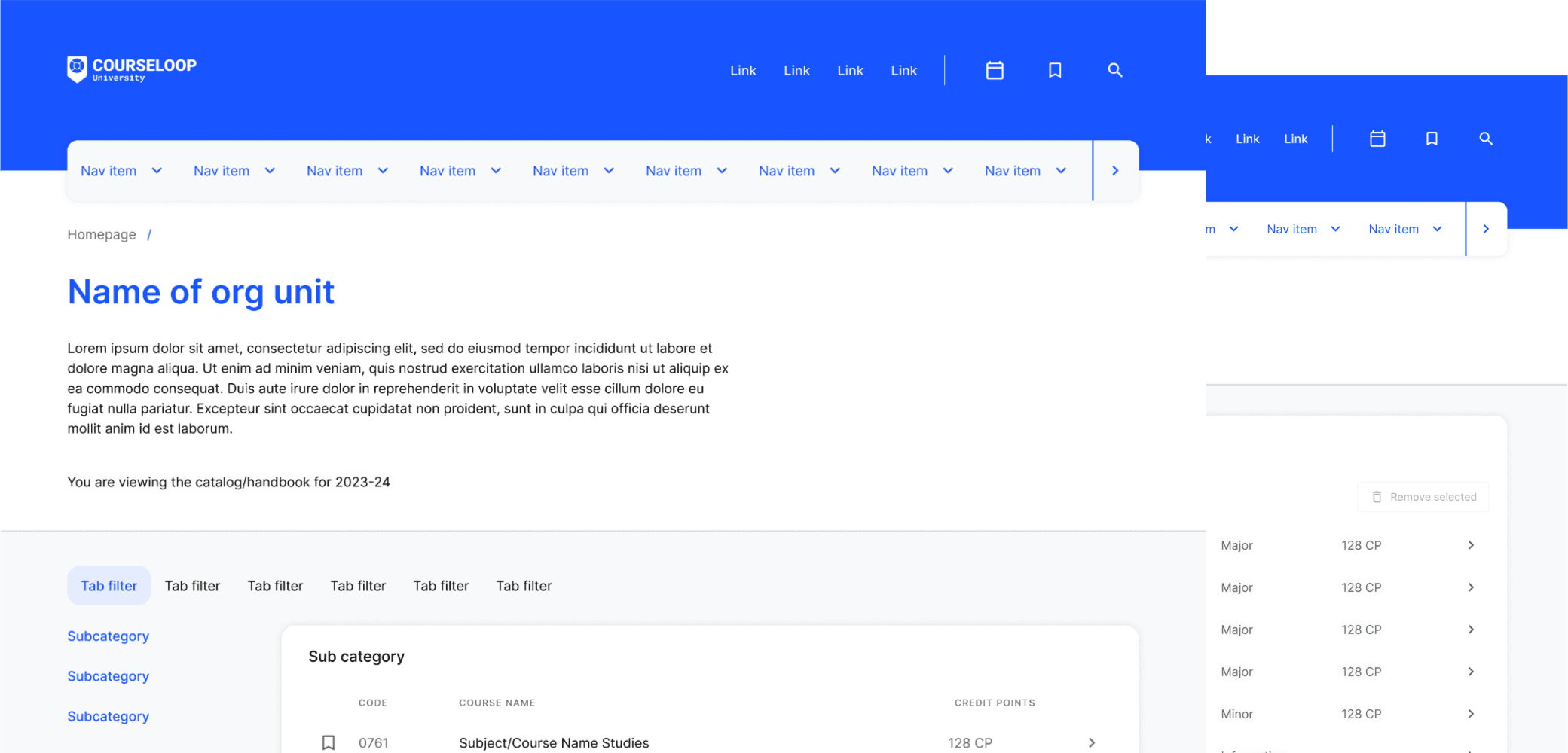 CourseLoop partnered with Exo Digital to enhance the Curriculum Publisher module, a critical tool that allows universities to publish their course catalogs on their websites. The project aimed to address client feedback, improve usability and accessibility, and refresh the visual design to ensure a cohesive, brand-aligned student experience. Our focus was on creating a more intuitive interface, improving accessibility, and ensuring the published content accurately reflected each university's unique brand identity.